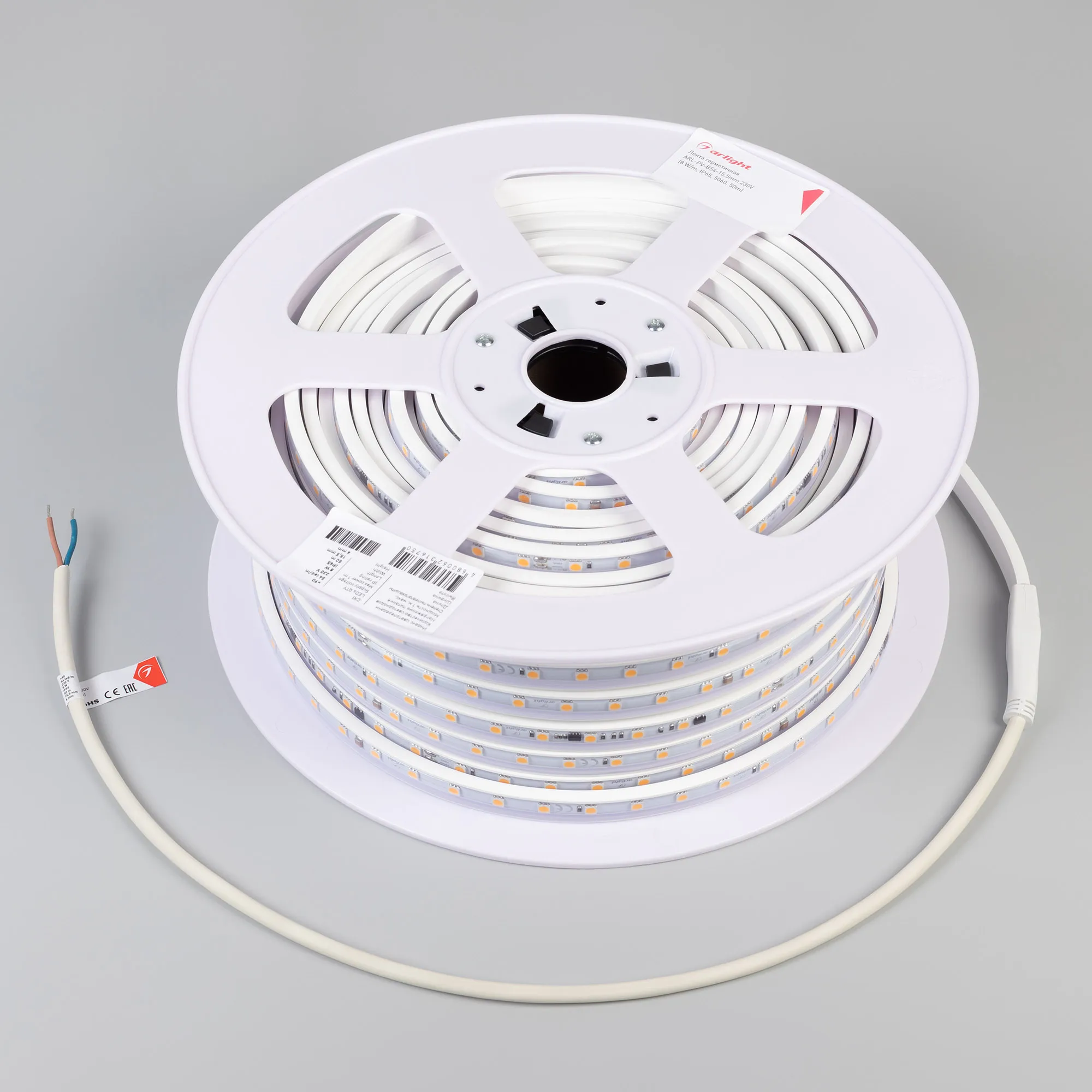 Светодиодная герметичная лента ARL серии B54, IP65 (PV - трубка, ПВХ экструзия). Светодиоды 5060, 54 шт/м, белая плата шириной 12 мм. Цвет БЕЛЫЙ 6000K, индекс цветопередачи CRI>90, угол 120°. Питание 230 В, мощность 8 Вт/м (80 Вт на 10 м). Размеры 10000x15.5x6 мм. Мин. отрезок 500 мм, 27 светодиодов. Цена за 1 м. Светодиодная лента крепится с помощью скоб (приобретаются отдельно), 3M скотч отсутствует. Катушка 10 м.