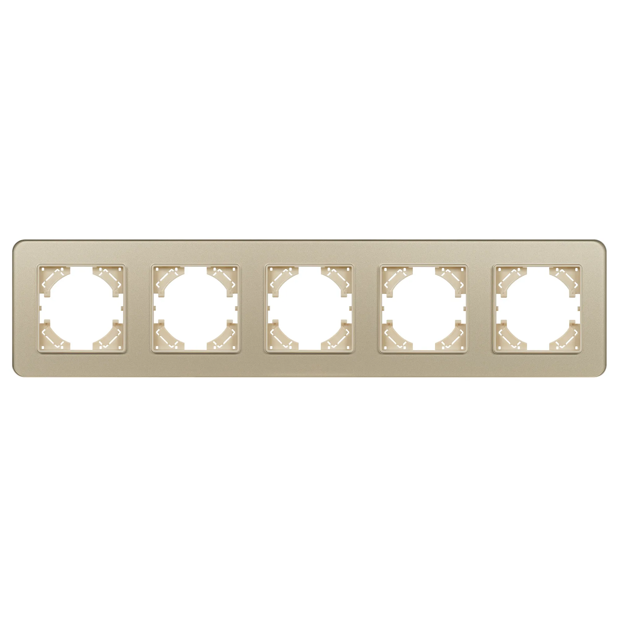 Рамка стеклянная на 5 постов, под встраиваемый механизм. Цвет - золотой. Уровень герметичности IP20. Ориентация монтажа - горизонтальная (основным ориентиром служат посадочные выступы для накладки механизма).