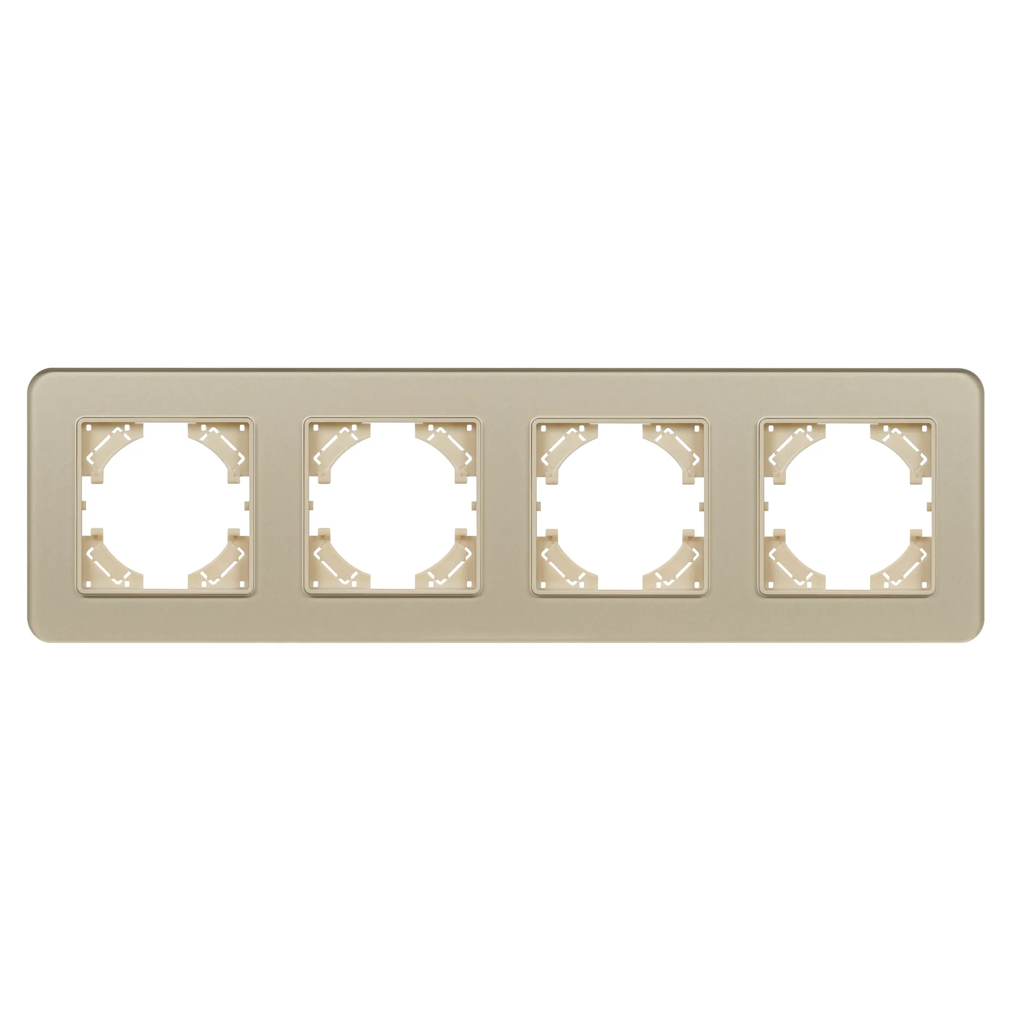 Рамка стеклянная на 4 поста, под встраиваемый механизм. Цвет - золотой с Soft-Touch покрытием. Уровень герметичности IP20. Ориентация монтажа - горизонтальная (основным ориентиром служат посадочные выступы для накладки механизма).
